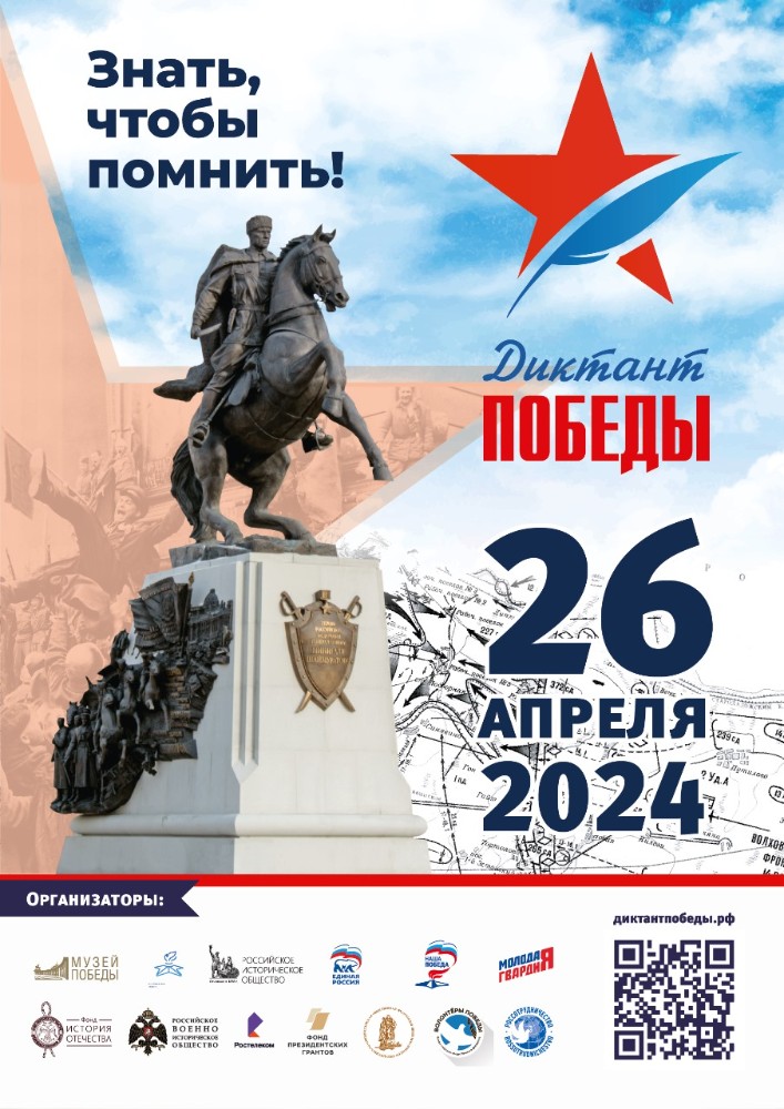 Шестая акция «Диктант Победы» пройдет 26 апреля 2024 года на площадках по всей России и за рубежом. Организаторами Международного исторического диктанта на тему событий Великой Отечественной войны «Диктант Победы» выступили - региональное отделение партии «Единая Россия» совместно с Российским историческим обществом, Российским военно-историческим обществом и Всероссийским общественным движением «Волонтеры Победы». «Диктант Победы» проводится на официальном сайте акции - диктантпобеды.рф. Его участники смогут проверить свои знания об истории Великой Отечественной войны. Централизованная система массовых библиотек г. Уфы присоединяется к акции. «Диктант Победы» пройдет в массовых библиотеках столицы в третий раз. Все желающие смогут написать Диктант на следующих площадках: - Центральная городская библиотека (ул. Комсомольская, 138); - Модельная библиотека № 6, ул. Революционная, 165; - Модельная библиотека № 10, ул. Гафури, 17; - Модельная библиотека № 31, ул. Кольцевая, 104; - Модельная библиотека № 35, ул. Ухтомского, 12; - Модельная библиотека № 36, ул. Ген. Горбатова, 3/1. Начало в 14:00 часов. Также на официальном сайте акции диктантпобеды.рф опубликован тренировочный тест. Он поможет участникам проверить свои знания событий Великой Отечественной войны и лучше подготовиться к написанию «Диктанта Победы». Все вопросы составлены профессиональными экспертами-историками Российского исторического общества (РИО). Задания находятся в разделе «Тесты» (подраздел «Тренировочные тесты») на официальном сайте акции – диктантпобеды.рф. Всем участникам после проверки в личном кабинете доступен диплом в электронном виде с результатами тестирования. Пройти тест можно на сайте диктантпобеды.рф в разделе «Тесты», перейдя по ссылке https://clck.ru/34AQQV. Приглашаем всех желающих принять участие в «Диктанте Победы»!