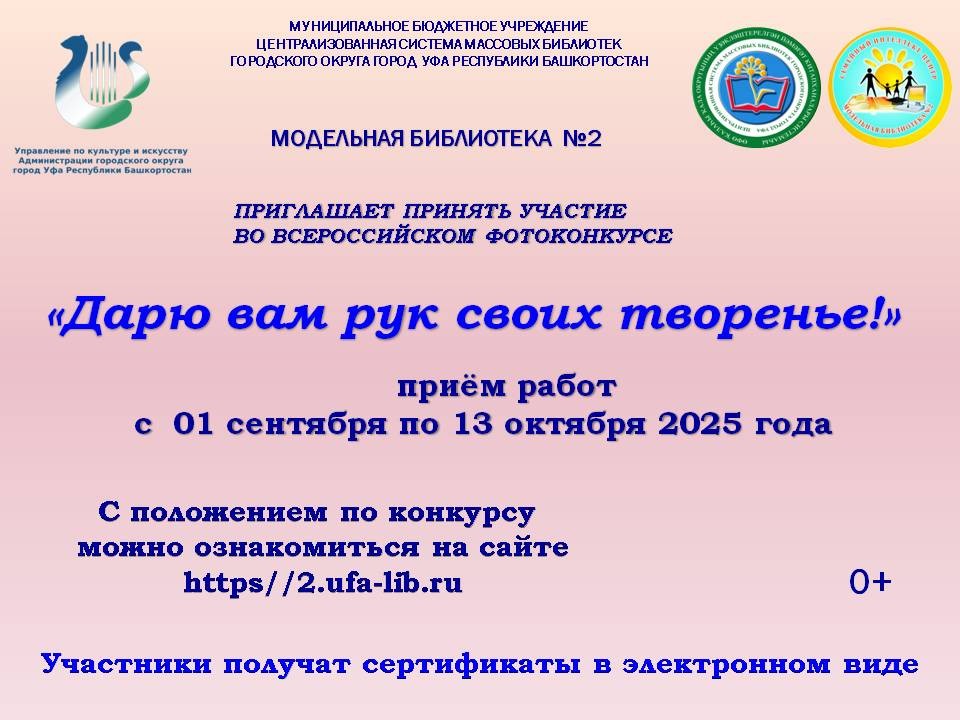 С 1 сентября по 28 октября 2025 года проходит фотоконкурс «Дарю вам рук своих творенье», посвященный Дню бабушек и дедушек в России. Его участником может стать любой желающий без возрастных ограничений. Организатором конкурса выступает модельная библиотека № 2 МБУ Централизованная система массовых библиотек ГО г. Уфа РБ. Для участия принимаются фотографии в формате jpg размером не более 20 Мб, любого жанра по теме конкурса, отображающие подарок (поделку) для людей старшего поколения, сделанный своими руками. Обязательное условие участия - стать подписчиком официальной группы библиотеки-организатора в социальной сети ВКонтакте https://vk.com/biblioteka2_ufa Конкурс проходит в два этапа - прием заявок и работ и голосование за лучшую работу. До 13 октября (до 23:59 часов по московскому времени) участникам необходимо отправить заявку, заполнив Яндекс форму https://forms.yandex.ru/u/6895db37068ff03f4eae7beb и прикрепить фотографию. Голосование за лучшую работу пройдет с 20 по 27 октября на официальном сайте модельной библиотеки № 2 https://2.ufa-lib.ru. Итоги фотоконкурса будут опубликованы 28 октября 2025 года на официальном сайте модельной библиотеки № 2 https://2.ufa-lib.ru, а также в официальной группе библиотеки-организатора социальной сети ВКонтакте https://vk.com/biblioteka2_ufa. Все участники получат яркие, оригинальные сертификаты участников, а три победителя, набравшие наибольшее число голосов по итогам голосования, станут обладателями именных дипломов победителей! Подробно с условиями участия можно ознакомиться В ПОЛОЖЕНИИ. Станьте участником фотоконкурса «Дарю вам рук своих творенье» и вашу уникальную работу увидят тысячи жителей нашей необъятной страны!