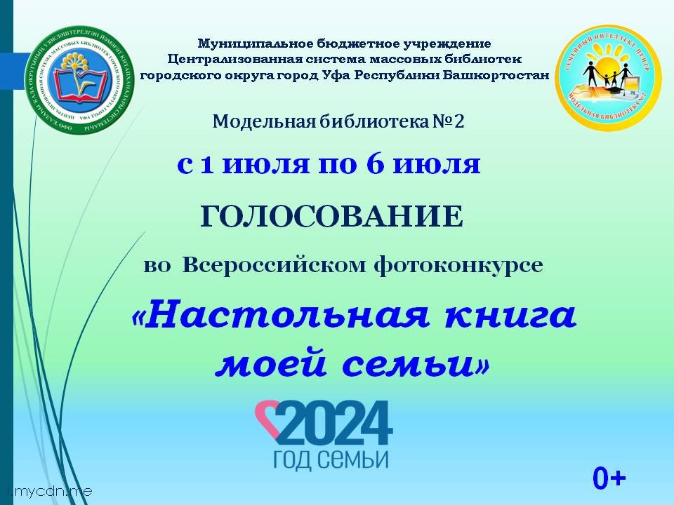 2024 год объявлен в России Годом семьи в целях популяризации государственной политики в сфере защиты семьи, сохранения традиционных семейных ценностей. Одной из самых главных ценностей является традиция семейного чтения. Когда родители, бабушки и дедушки читают малышам стихи и сказки, между ними протягиваются тысячи незримых ниточек, прочно связывающих поколения тёплыми чувствами и воспоминаниями. С 13 мая по 8 июля 2024 года проходит Всероссийский фотоконкурс «Настольная книга моей семьи». Голосование пройдет с 01.07 по 06.07 июля (до 12:00 часов по московскому времени) ![]()