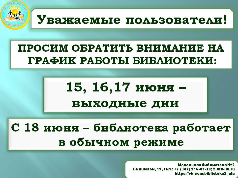 Дорогие читатели и подписчики! Обращаем ваше внимание на изменение графика работы библиотеки в праздничные дни, посвященные празднику Курбан-байрам. 15, 16, 17 июня - выходные дни. 18 июня - библиотека работает по обычному графику. Приходите, мы всегда вам рады!!!