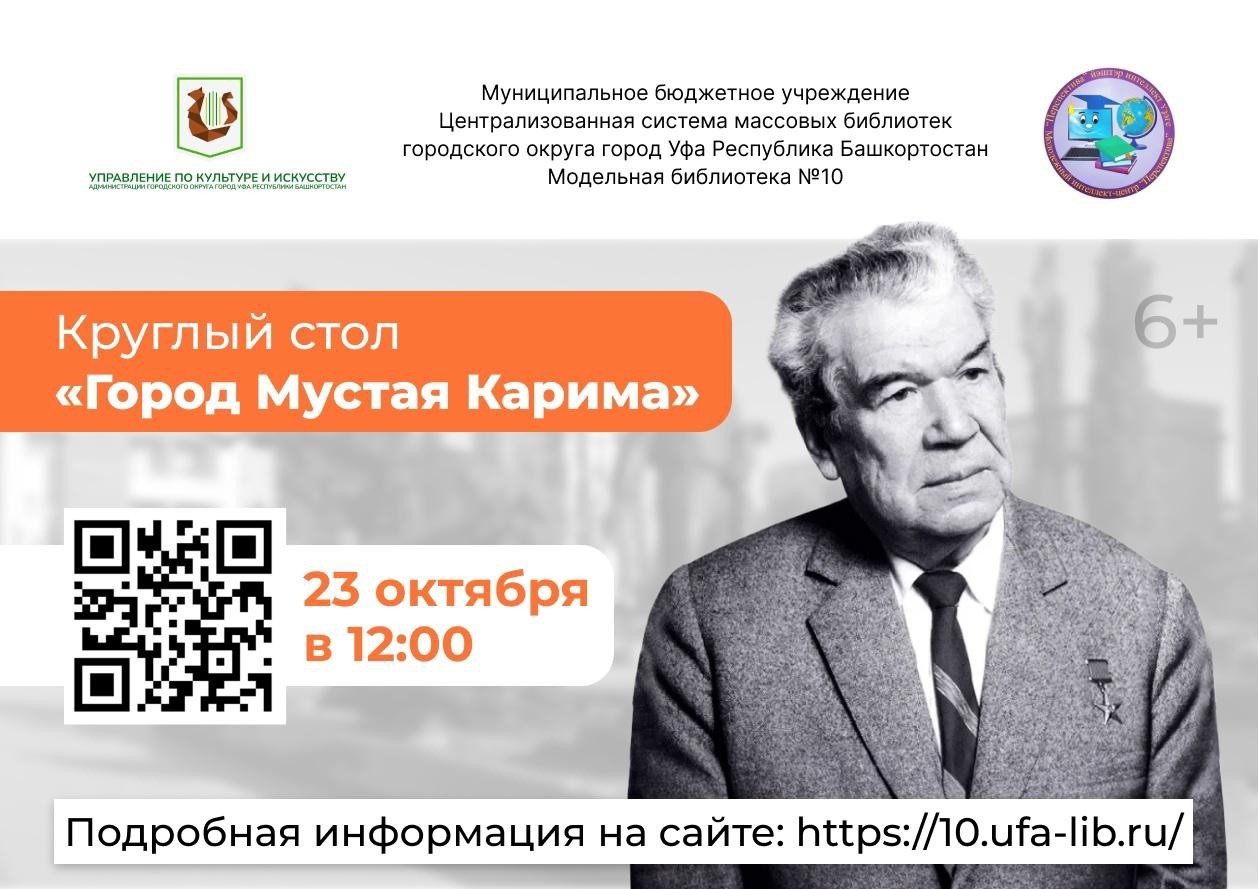 23 октября в 12.00 в Модельной библиотеке № 10 (г. Уфа, ул. Гафури, 17) пройдет круглый стол «Город Мустая Карима», посвященный обсуждению жизни и творчества известного башкирского народного поэта Мустая Карима, чьи произведения внесли неоценимый вклад в развитие национальной культуры и литературы Башкортостана.
