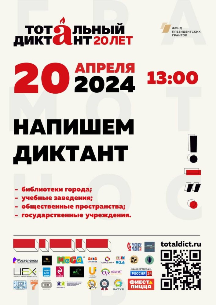 20 апреля 2024 года по всей России пройдет ежегодная акция «Тотальный диктант». В 2024 году столицей акции диктанта по решению жюри выбран Томск. Автором текста о дневниках как явлении стала писательница Анна Матвеева. В Уфе акция пройдет уже в 13 раз. Каждый желающий может прийти, написать диктант и проверить уровень своей грамотности. Традиционно площадками Тотального диктанта станут библиотеки Централизованной системы массовых библиотек ГО г. Уфа РБ. Тотальный диктант - 2024 пройдет в офлайн формате на 13 площадках массовых библиотек Уфы: - Центральная городская библиотека - ул. Комсомольская, 138; - Библиотека № 1 - ул. Шафиева, 6; - Модельная библиотека № 2 - ул. З. Биишевой, 15; - Модельная библиотека № 4 - проспект Октября, 9; - Модельная библиотека № 6 - ул. Революционная, 165; - Модельная библиотека № 10 - ул. Гафури, 17; - Модельная библиотека № 13 - ул. Ухтомского, 12; - Библиотека № 14 - ул. Ахметова, 316; - Модельная библиотека № 20 - ул. Акназарова, 24; - Модельная библиотека № 26 - ул. М. Жукова, 11/2; - Модельная библиотека № 29 - проспект Октября, 97/1; - Модельная юношеская библиотека № 41 - ул. Калинина, 11; - Библиотека № 46 - ул. Зеленая, 7.