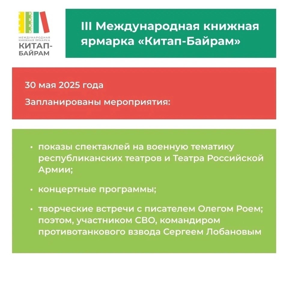 Дорогие читатели! Уже ЗАВТРА состоится открытие III Международной книжной ярмарки «КИТАП-БАЙРАМ» Главной темой ярмарки станет «Сила слова». Первый день форума будет посвящен Великой Отечественной войне и пройдет под девизом «Слово о подвиге». Девиз 31 мая – «Слово о вечном», день посвящен классической литературе. 1 июня в честь Дня защиты детей темой станет «Слово о будущем». Для гостей праздника выступит Детский сводный хор Республики Башкортостан – 600 детей исполнят песни в честь 80-летия Великой Победы! Читайте подробную программу ярмарки: https://kitap-bayram.ru/programma-mezhdunarodnoj-knizhnoj-jarm/ |