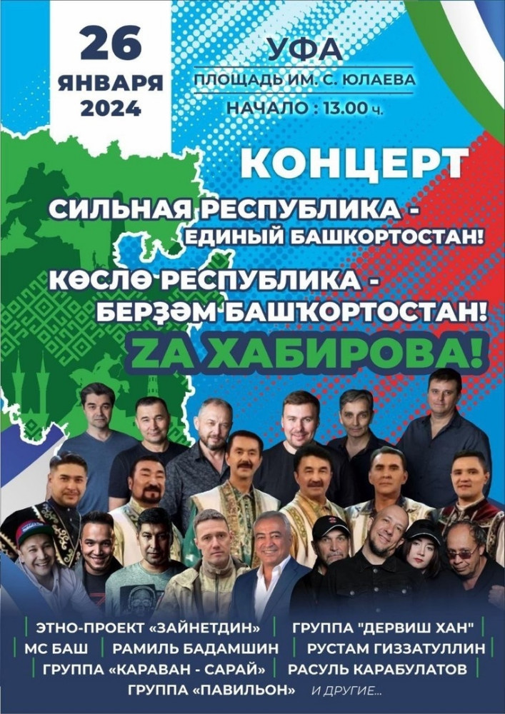 В пятницу, 26 января, в Уфе на площади перед зданием Телецентра состоится концерт в поддержку Главы Республики Башкортостан Радия Хабирова. Инициаторами проведения мероприятия выступили известные общественники, деятели культуры. Основная идея концерта — поддержать Главу Республики Башкортостан, выступающего за единство республики, единый многонациональный народ Башкортостана.